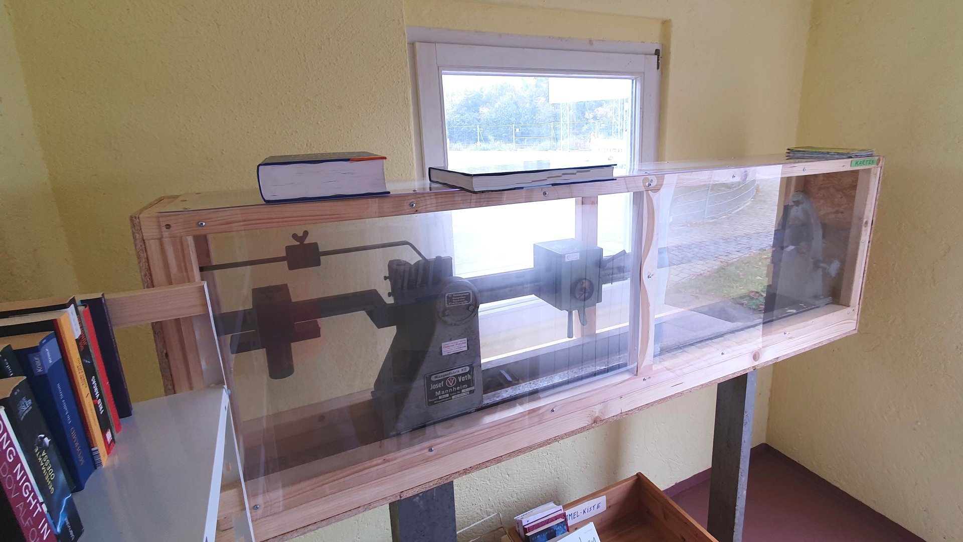 Die eigentliche Balkenwaage, die grundsätzlich noch funktioniert (aber schon lange nicht mehr geeicht wurde) wurde mit Plexiglas eingehaust und kann im Inneren der Bibliothek angesehen werden.