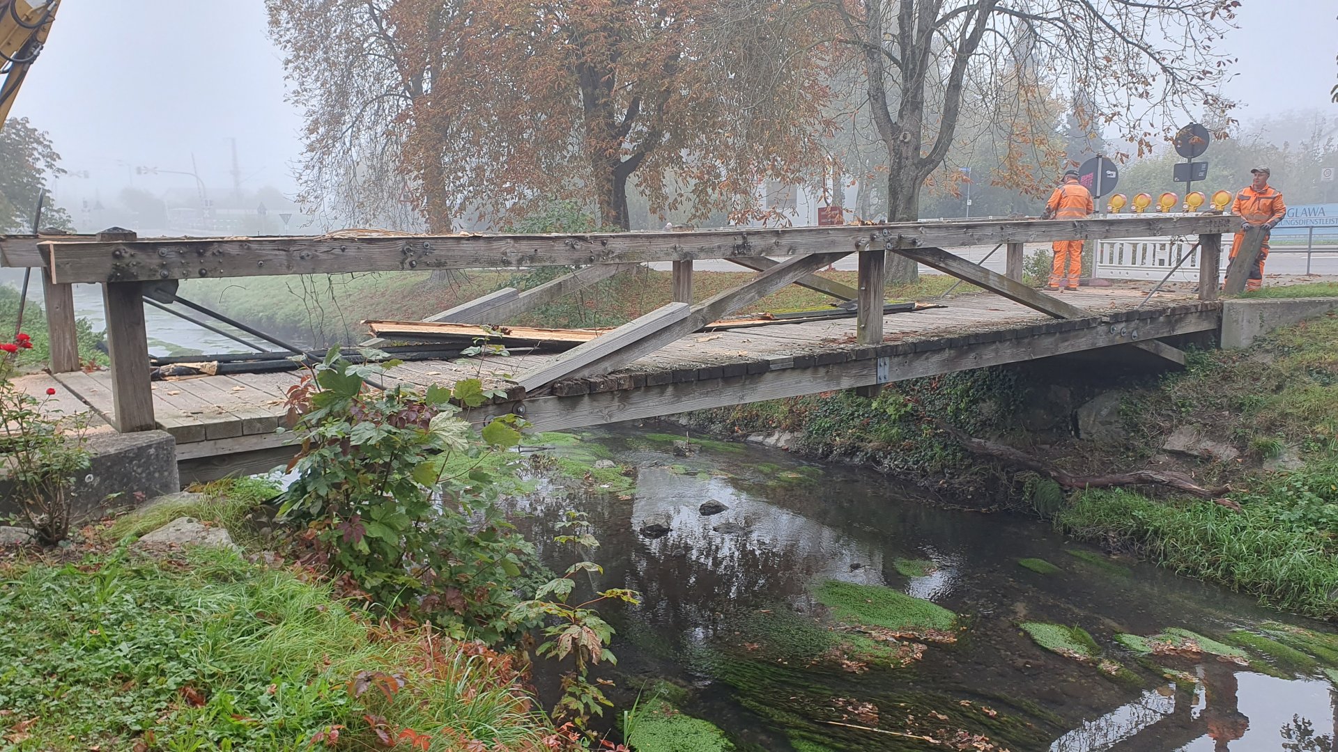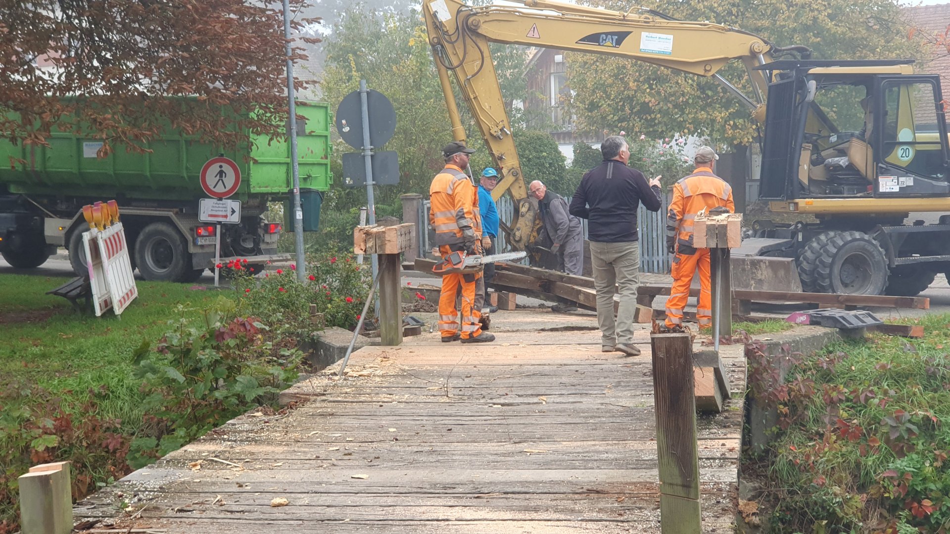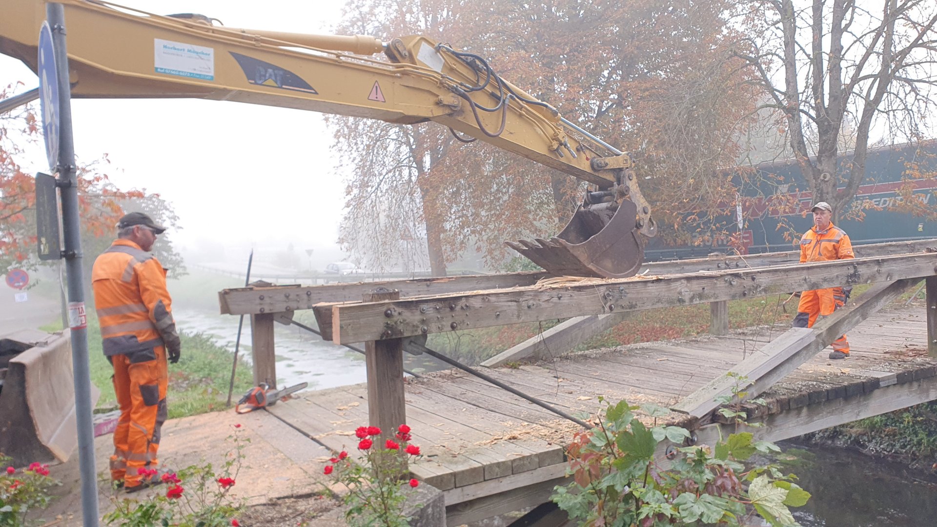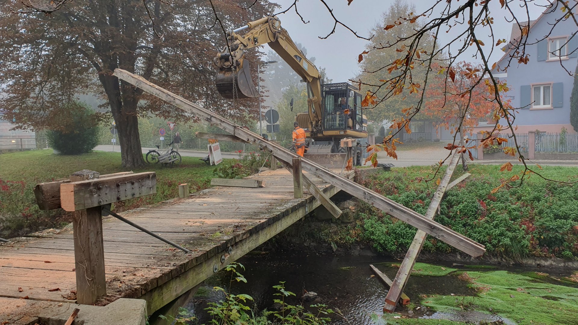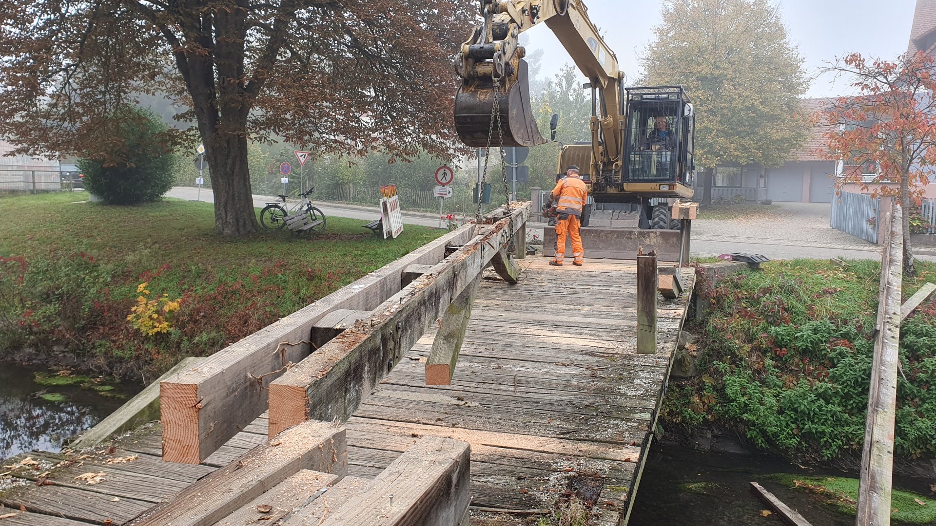 Zusammen mit dem starken Bagger der Fa. Maucher und ihrem umsichtigen Baggerfahrer haben zwei Bauhofarbeiter am Montagmorgen die marode Fußgängerbrücke - 1995 aus Holz errichtet - über den Neugraben (Brandbach) abgerissen.