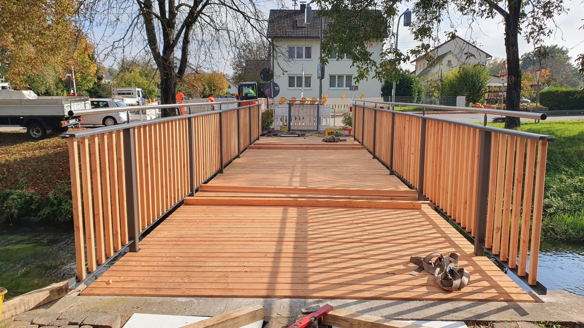 Die Brücke wurde zuvor vom Metallbau Maurer im Gewerbegebiet Gottenheim hergestellt, lackiert und komplett mit Holzbohlen aus Douglasie vormontiert.