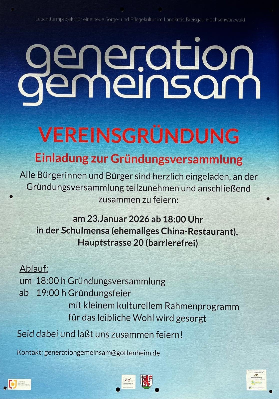 Um diesem Engagement eine Heimat und Organisationsform zu geben, beabsichtigen wir die Gründung des Vereins „generation gemeinsam Gottenheim e.V.“.
