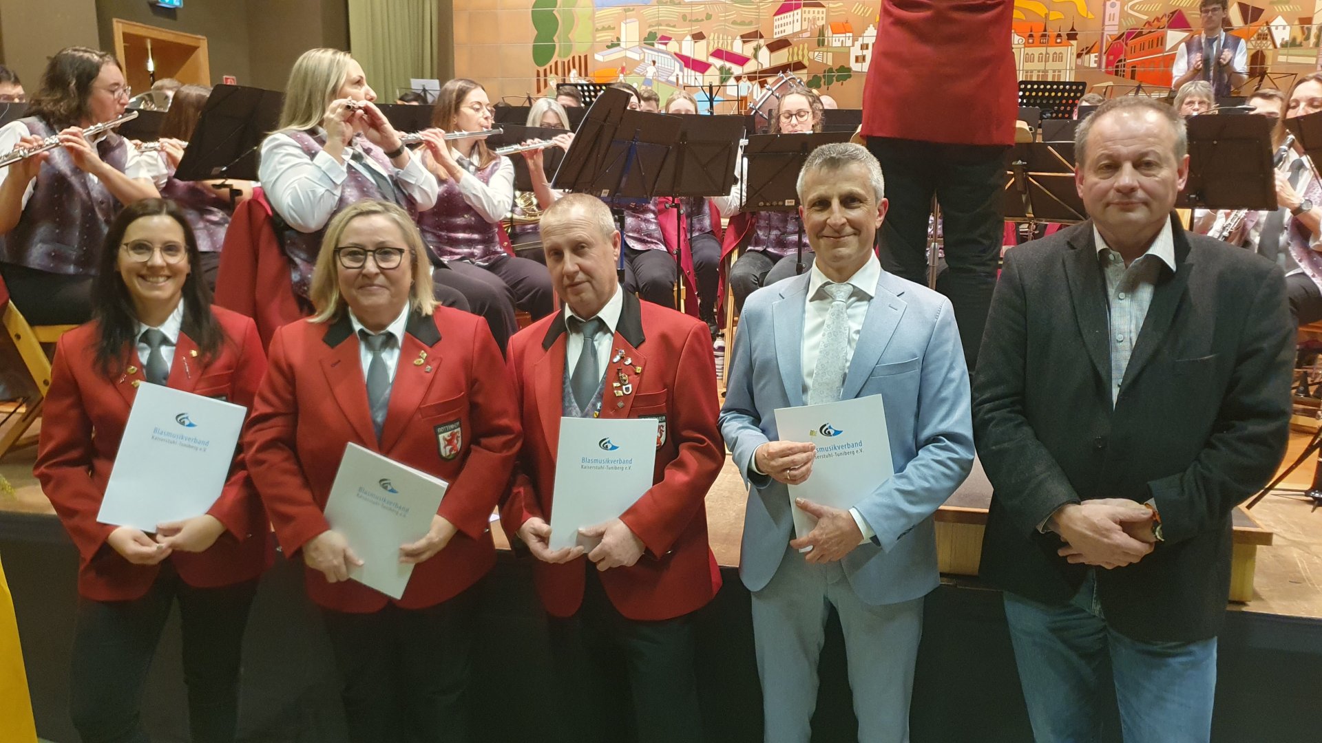Im Rahmen des Konzertabends wurden mehrere langjährige aktive Mitglieder für ihr Engagement im Musikverein geehrt: Für ihr jahrzehntelanges musikalisches Wirken wurden Viola Großklaus und Peter Schlitter für jeweils 50 Jahre, Andreas Thoman-Muth für 40 Jahre sowie Ann-Kathrin Dangel für 25 Jahre aktive Mitgliedschaft ausgezeichnet.