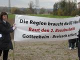 Alexandra Dankert, Vorsitzende der Bürgerinitiative, dankte allen Helfern für die Aufstellung des Schildes. Es sei ganz wichtig, möglichst viele Menschen schon im Vorfeld für die zukünftigen Probleme zu sensibilisieren. Schließlich würde der Verkehr ab 2010 hauptsächlich durch Gottenheim fließen. Dies bedeute Lärm und Gestank, aber auch Gefahren für Menschen, die die Bötzinger Straße queren müssten.