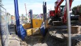 Unterm Bahngleis wird ein 1 m dickes Stahlrohr (für 80 cm Kanal, Wasser-, Strom- und Telefon-Kabel) durchgepresst.