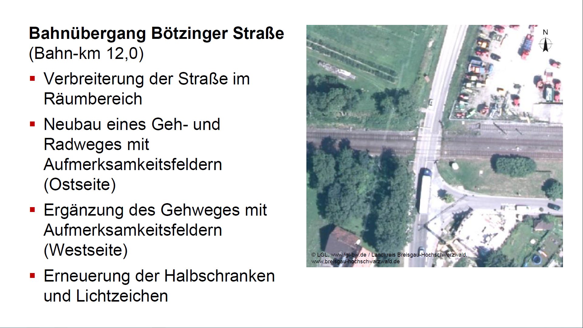 Auf der Breisacher Bahn sind im Zuge des Streckenausbaus mit einer künftig deutlich leistungsfähigeren Betriebsführung an insgesamt 23 Bahnübergängen technische Anpassungen und Umbauarbeiten notwendig. Vier Bahnübergänge werden entsprechend den genehmigungsrechtlichen Vereinbarungen geschlossen.