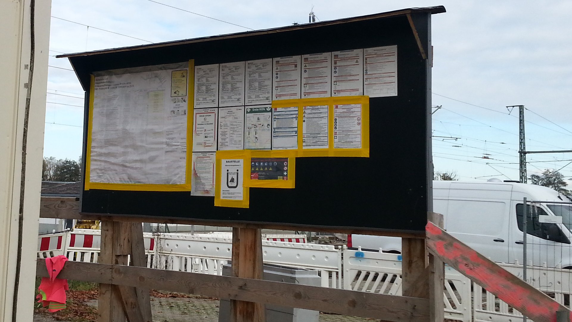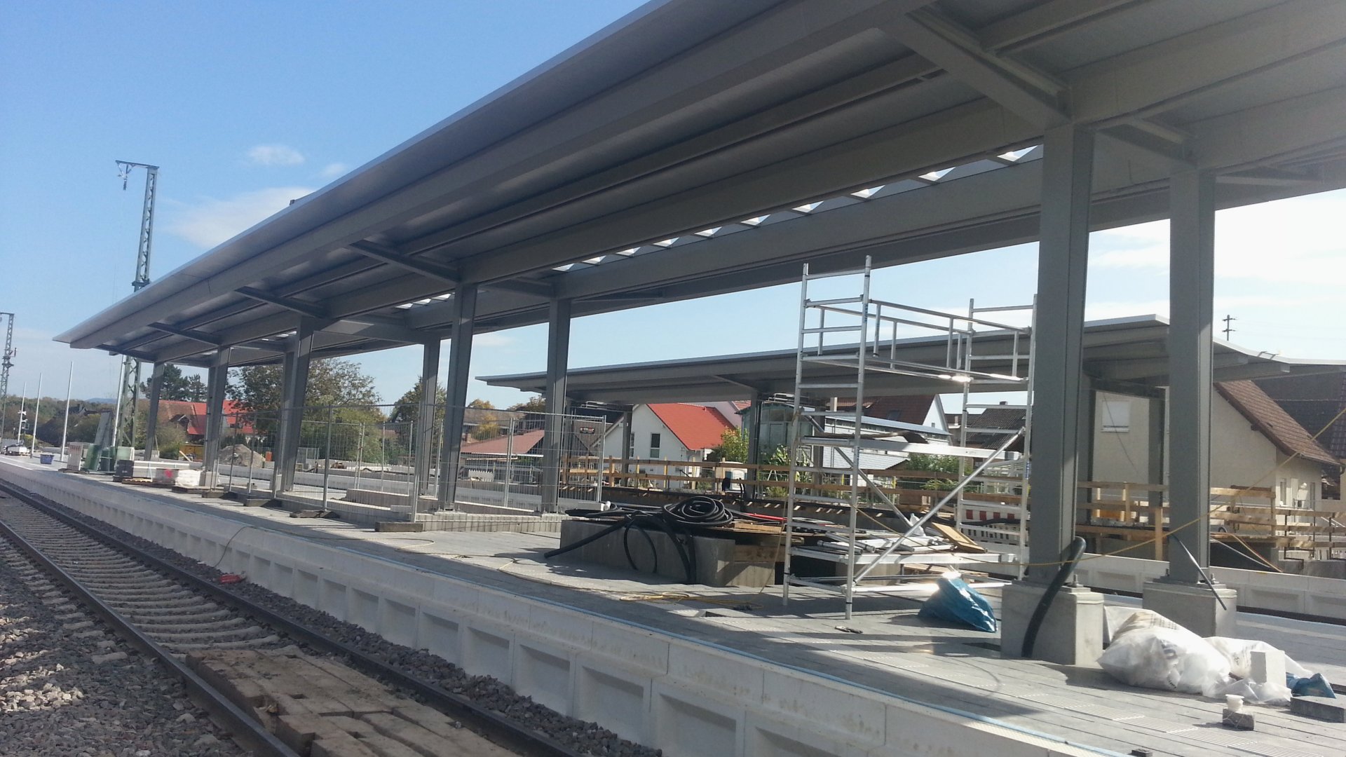 In der Sonne glitzert das neue Kupfer der Oberleitungen, an der Brücke sind die Schutzgläser mit Absturzsicherung & Vogelschutz montiert. Lärmschutzgitter liegen noch träge herum, während alte Schwellen aufgestapelt auf ihren Abtransport warten und neue Leitungen werden auch am Sonntag richtig aufgehängt. Die neue Brücke über den Mühlbach ist freigegeben! Am Bahnhof sind die neuen Schutzdächer für die Bahnsteige aufgestellt, Schrankenanlagen warten auf ihre Montage und der Übergang ist noch gesperrt.