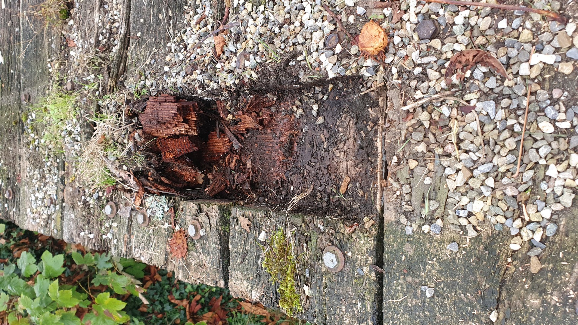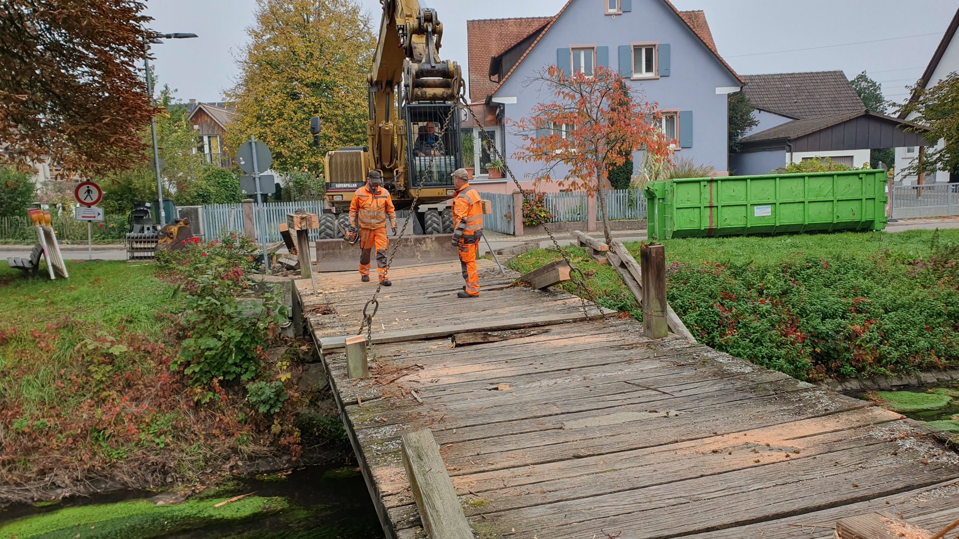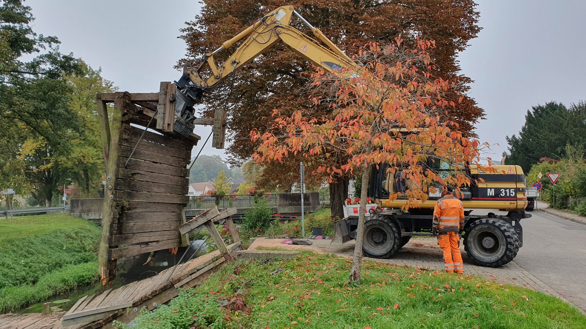 Zusammen mit dem starken Bagger der Fa. Maucher und ihrem umsichtigen Baggerfahrer haben zwei Bauhofarbeiter am Montagmorgen die marode Fußgängerbrücke - 1995 aus Holz errichtet - über den Neugraben (Brandbach) abgerissen.