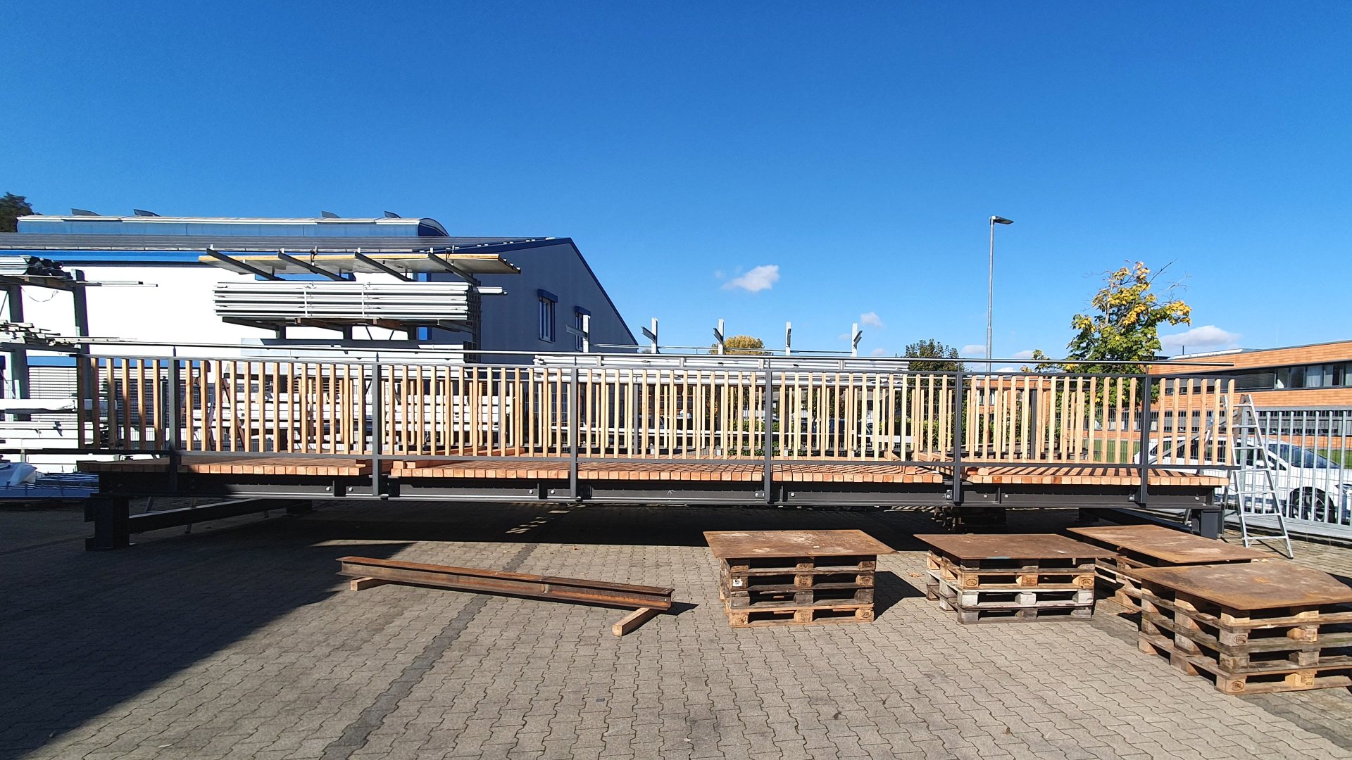 Die Brücke wurde zuvor vom Metallbau Maurer im Gewerbegebiet Gottenheim hergestellt, lackiert und komplett mit Holzbohlen aus Douglasie vormontiert.