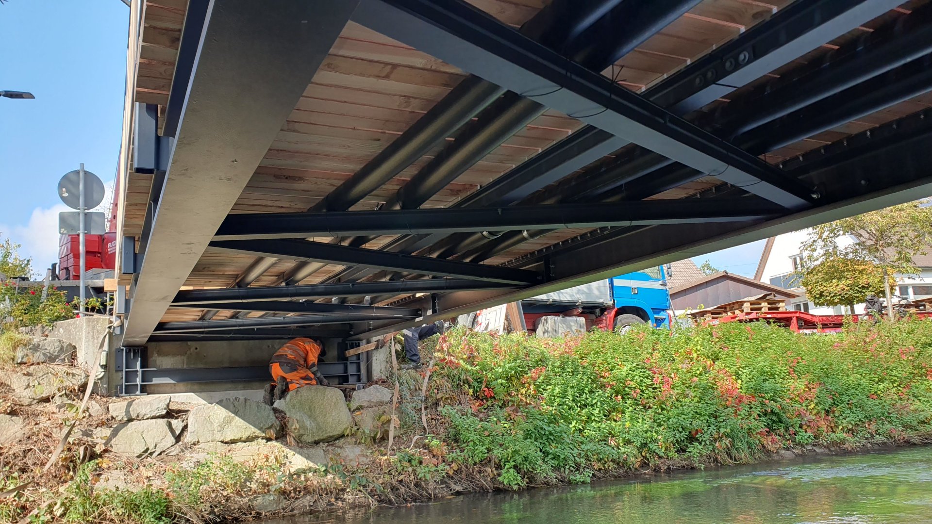 Zusammen den Bauhofmitarbeitern wurde sie mit Schwerlastgurten und Stahlketten an den Kran gehängt, in den Herbsthimmel hochgezogen, vorsichtig über den Bach geschwenkt und dann ganz langsam in die vorhandenen Beton-Widerlager an den Ufern abgelassen.
