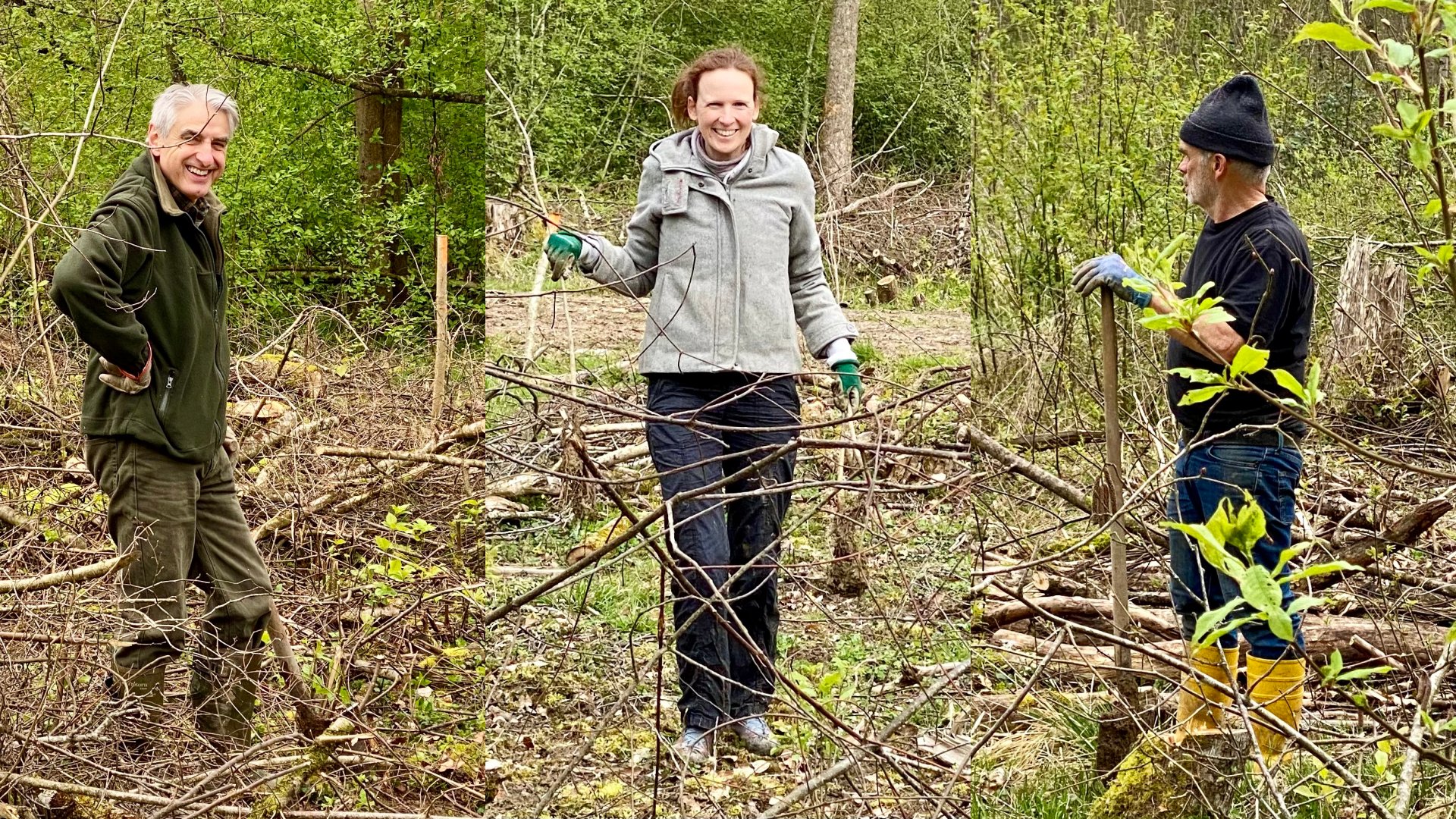 Dreieinhalb Stunden wurde bei sehr durchwachsenem Wetter in getrennten Gruppen der Waldrand geputzt, 70 neue Bäume geplanzt und entlang des Kanalwegs / Flutmulde Holz und Gestrüpp entfernt.