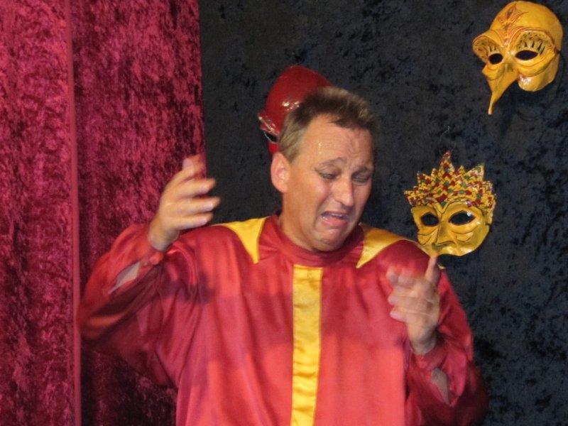 Doch klassisch spielt Bernd Lafrenz nicht – auch wenn er immer wieder Shakespearsche Original-Textpassagen in seinen Auftritt einbaut. Mit Hilfe von verschiedenen Masken aber vor allem durch sein unglaubliches pantomimisches und sprachliches Talent spielt Bernd Lafrenz alle Rollen selbst - und das schon seit etlichen Jahren landauf, landab. Lafrenz ist Shakespeare-Schauspieler aus Leidenschaft. Er hat sich auf den englischen Meister eingeschworen: Und er spielt Shakespeare in einer eigenen, ungemein lebendigen und schöpferischen Art so gut, dass das Publikum schließlich animiert wird, selbst mitzumachen, die Scheu verliert - und auch die Scheuklappen. Die klassische Vorlage wird parodistisch verfremdet bis zum grotesk- komischen Krimi. Dabei bleibt Shakespeares Hamlet inhaltlich bestehen, und auch ein Rest Shakespeare'scher Sprache bleibt immer erhalten, zuweilen als bewusst gegen die Clownerie gesetzter Kontrapunkt. In erster Linie will Bernd Lafrenz dem Publikum Spaß vermitteln - ein Bad in der Menge inbegriffen. Und das ist ihm in der Gottenheimer Bürgerscheune gelungen.