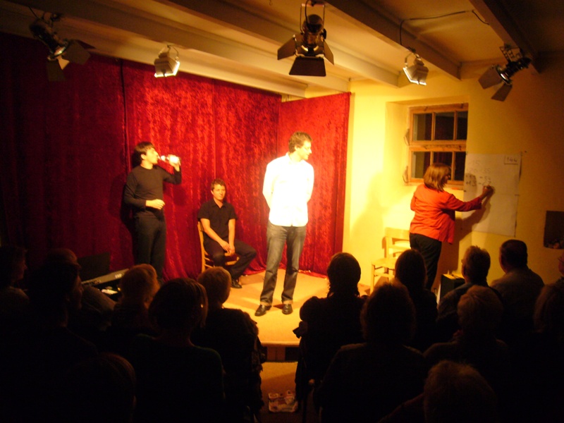 Die Theater-Gruppe forderte die Zuschauer auf, ihnen Begriffe zuzurufen, die sie dann in den Szenen verwendeten. Die Schauspieler improvisierten so gekonnt und so lustig, dass die Zuschauer