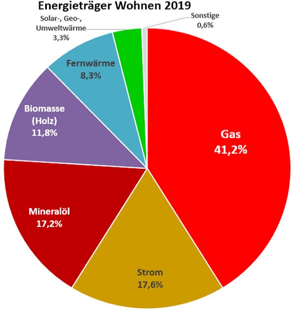 Überwiegend deckten die privaten Haushalte 2019 ihren Wohn-Energiebedarf weiterhin durch Gas, welches 41,2 % des Gesamtverbrauchs ausmachte (-0,5 Prozentpunkte gegenüber 2018). Gas bleibt damit der mit Abstand meistgenutzte Energieträger der privaten Haushalte.