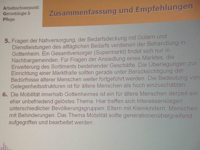 Am 18. Mai 2006 wurden die Ergebnisse der Sozialraumanalyse Gottenheim von Prof. Thomas Klie und Thomas Pfundstein von der Evang. Fachhochschule Freiburg dem interessierten Publikum in der Gymnastikhalle vorgestellt.