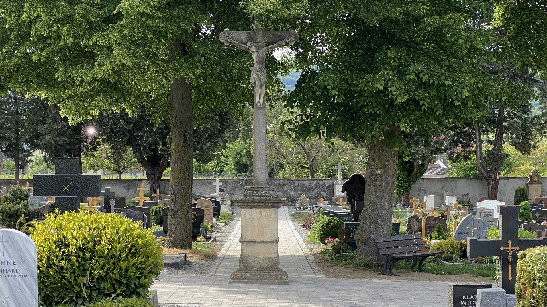 Das Friedhofskreuz steht inmitten des Gottenheimer Friedhofs an der Kreuzung der Wege