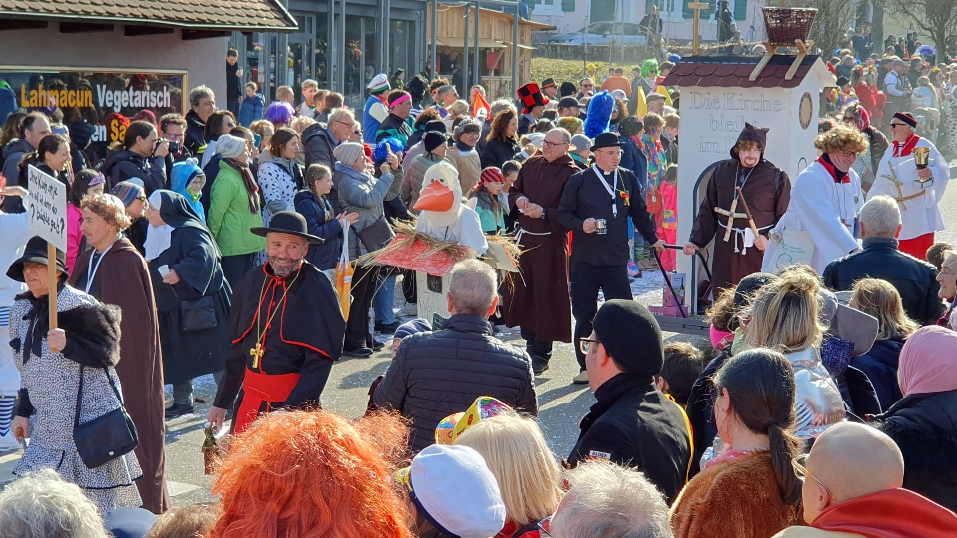 Auch das Rathausteam war wie jedes Jahr beim Umzug dabei und der Männergesangverein thematisierte den drohenden Verkauf der katholischen Kirche mit dem Spruch „Die Kirche bleibt im Dorf“.