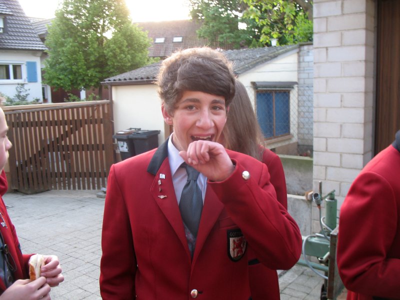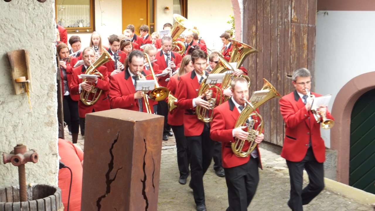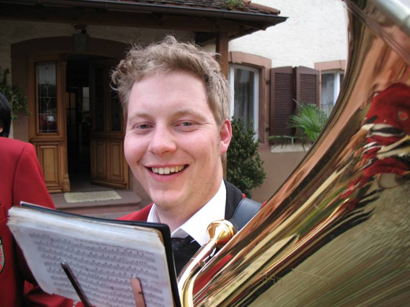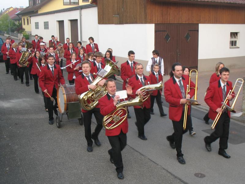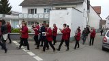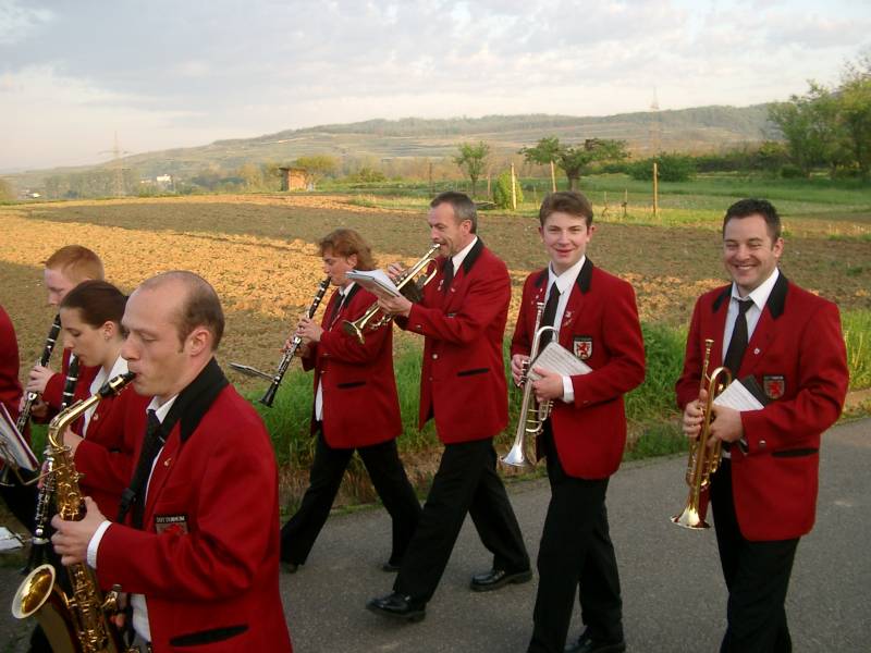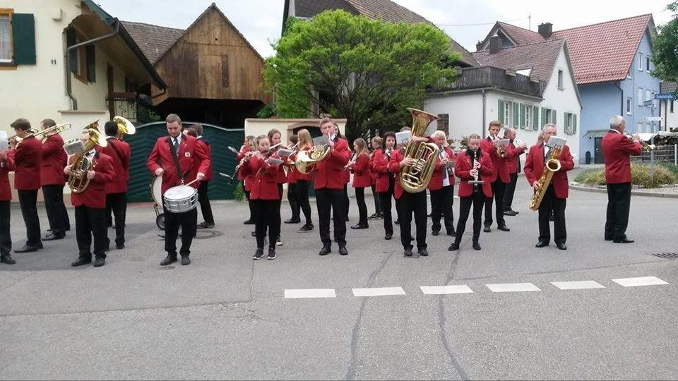 Die übrigen Musiker trafen sich um 07:00 Uhr am Vereinsheim, um dort gemeinsam einen ersten Marsch zu spielen. Da der Regen ein Musizieren während des Marschierens bedauerlicherweise nicht zuließ, wurde an verschiedenen Unterständen, teilweise zur Überraschung der Anwohner, gespielt. Zu einem ausgiebigen Frühstück hatte Familie Bösch eingeladen. Gut gestärkt ging es in die Maienstraße, um danach bei Familie Dangel in der Hintergasse zu Wein und Gugelhupf einzukehren. Nach einem weiteren musikalischen Zwischenstopp in der Carl-Frey-Straße, hat uns zum Abschluss – wie jedes Jahr – Walter Hess zum Mittagessen eingeladen, wo wir uns nach einigen Märschen bei Braten, Kartoffelsalat sowie diversen Getränken erneut stärken konnten.
