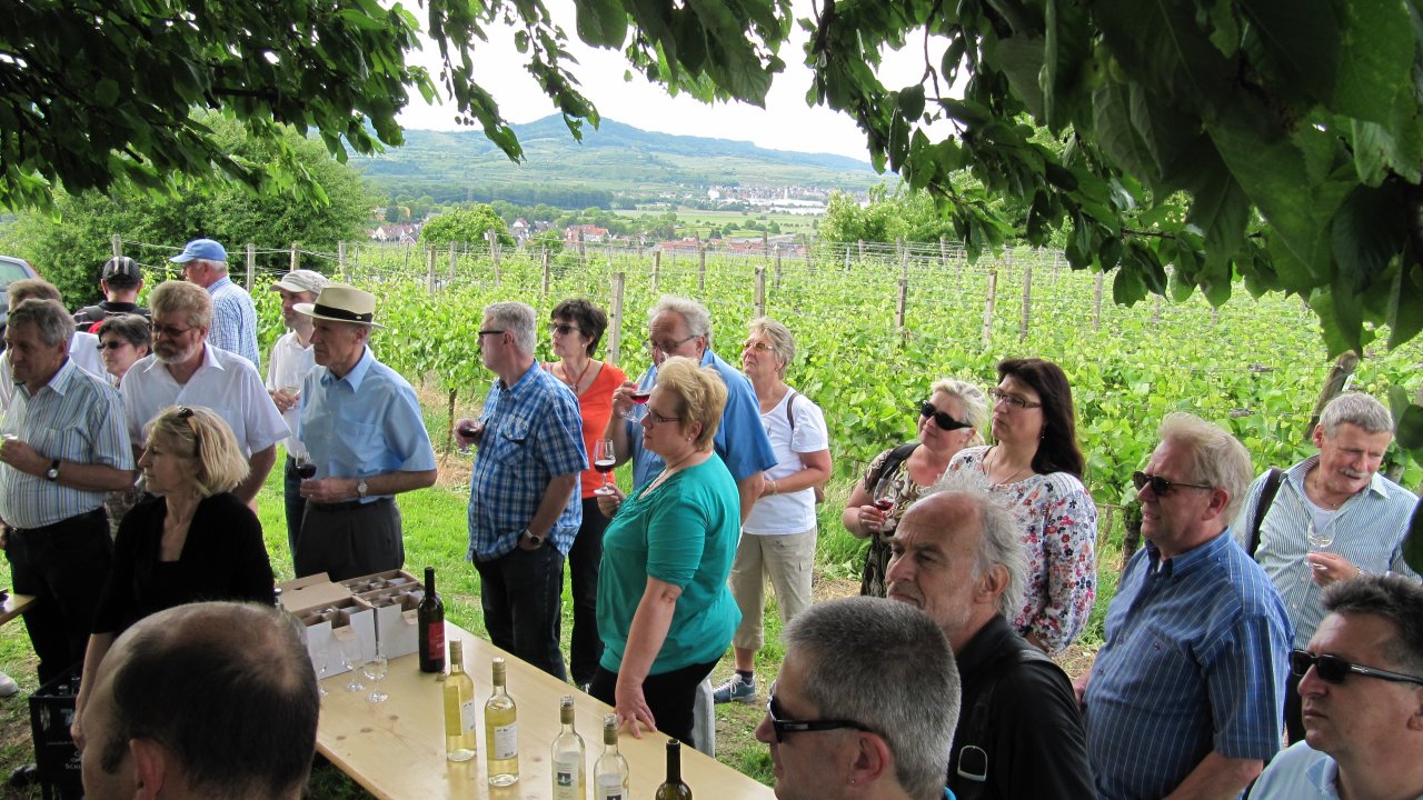 Am 15. und 16. Juni 2013 besuchte uns eine 30-köpfige Delegation aus Bodnegg um die Käse-Wein-Partnerschaft zu vertiefen... Nach einer staureichen Busfahrt gab es zunächst einen Sektempfang im Rathaushof, dann in der BürgerScheune eine kleine Einführung von Volker Kieber in die Besonderheiten Gottenheims, anschließend wanderte man gemeinsam die Rebhislitour, probierte dort einige Gottenheimer Weine und genoß den wunderbaren Rundumblick zum Schwarzwald, Kaiserstuhl und Vogesen.