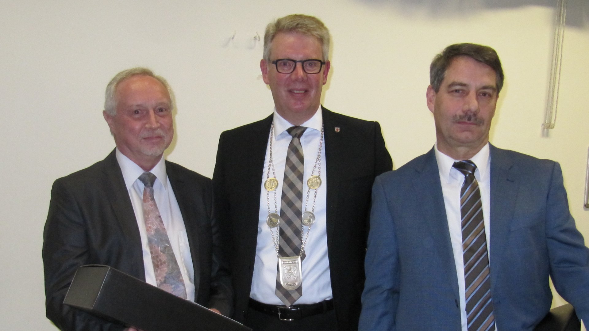 Anlässlich des Neujahrsempfangs trug Bürgermeister Volker Kieber erstmals auch die neue Amtskette der Gemeinde Gottenheim. Stellvertreter Kurt Hartenbach erläuterte den Hintergrund und die Bedeutung der Medaillen und Plakette der Amtskette, die nur zu besonderes feierlichen Anlässen getragen werden und unseren Heimatort Gottenheim repräsentieren soll. Für den Träger der Amtskette (der jeweilige Bürgermeister) soll sie Bürde, Ehre und Ansporn zugleich sein.